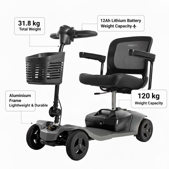 Extreem Lichtgewicht: Met een totaalgewicht van slechts 31 kg is dit een van de makkelijkst te tillen en te vervoeren scootmobielen.