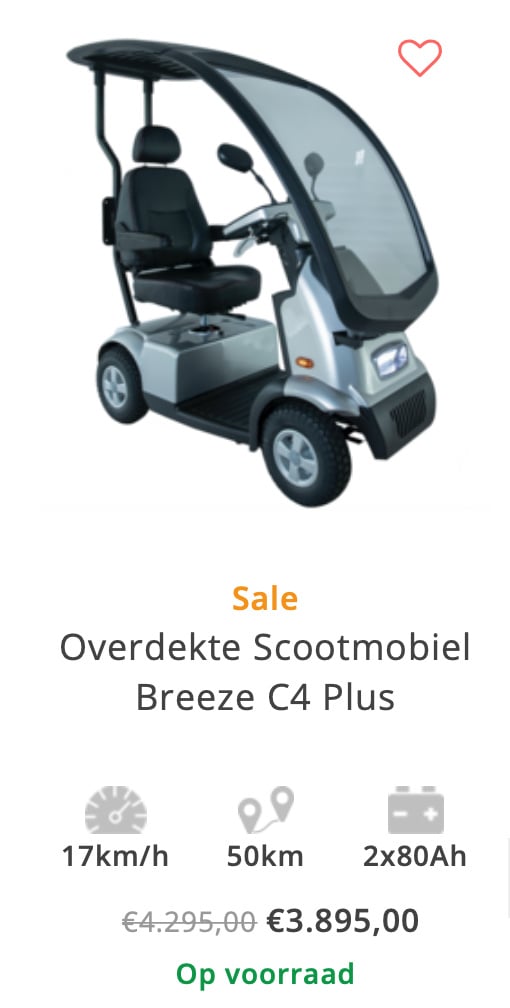 - Overdekte Scootmobiel Breeze C4 PlusLaat een reactie achter- Overdekte Scootmobiel Breeze C4 Plus- De nieuwe Overdekte Afikim Breeze C4 Plus is met zijn unieke ontwerp gemaakt voor maximale bescherming en veiligheid van de bestuurder. Uitstekende multifunctionaliteit en dus de perfecte scootmobiel voor diegenen met een actieve, dynamische en veelzijdige levensstijl. - De Overdekte Scootmobiel Breeze C PLUS heeft een stoer uiterlijk maar is compact genoeg om makkelijk te manoeuvreren in diverse ruimtes. Deze scootmobiel is standaard voorzien van een LCD display, LED verlichting en een comfortabele zitting. Optioneel is de Breeze C PLUS uit te voeren met een boodschappenkoffer achterop de overkapping. Optioneel is er veel mogelijk. Mocht gas geven met uw handen moeilijk voor u zijn kan er bijvoorbeeld ook gekozen worden om de Breeze C uit te laten voeren met voetgas. Daarnaast zijn er ook verschillende accessoires verkrijgbaar zoals schootskleden en voetenzakken voor de gebruiker. - Multifunctioneel