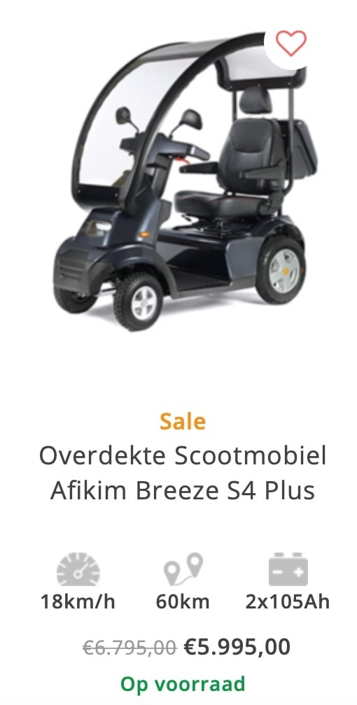- Overdekte Scootmobiel Afikim Breeze S4 PlusLaat een reactie achter- Overdekte Scootmobiel Afikim Breeze S4 Plus- De nieuwe Afikim Breeze S4 Plus Overdekte scootmobiel zorgt voor maximale bescherming en veiligheid van de bestuurder. Dankzij de perfecte ergonomie en zijn uitstekende rijcomfort is dit één van de meest toonaangevende scootmobielen in zijn categorie. - Dit luxe overdekte voertuig met een bewezen staat van dienst van hoge kwaliteit en langdurige betrouwbaarheid, zorgt voor comfortabel reizen en veiligheid. Dit allemaal op verschillende soorten terreinen zoals ruw terrein (met GT wielen). - Een enkele of een dubbele zitting, het model met 3 wielen (maximale wendbaarheid) of het model met 4 wielen (ultieme stabiliteit), welke keuze u ook maakt deze zal perfect bij u passen. - De Overdekte Afikim Scootmobiel Afikim Breeze S4 Plus is voorzien van een geavanceerd elektronisch systeem met een programmeerbaar bedieningspaneel met LCD scherm, waarop de gereden afstand afgelezen kan worden. Ergonomisch ontworpen en verstelbaar zodat de scooter aan de exacte eisen van de gebruiker kan voldoen. - De Overdekte Breeze S4 Plus Scootmobiel is volledig geveerd en voorzien van schokdempers. De luxe zitting is volledig instelbaar voor optimaal comfort en de scooter is voorzien van LED verlichting. - Achterop de rugleuning is een boodschappenkoffer bevestigd en voorop zit een handig boodschappenmandje. Voorzien van 2 spiegels en vele extra afsluitbare opbergvakken maken de Afikim Breeze S4 Plus Overdekte Scootmobiel compleet. - Lithium accuset in de scootmobiel - Lange levensduur