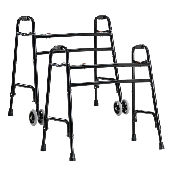 Het looprek is inklapbaar en verkrijgbaar in 2 breedtes, voorzien van 4 poten of met 2 massieve wielen aan de voorkant en 2 poten aan de achterkant.